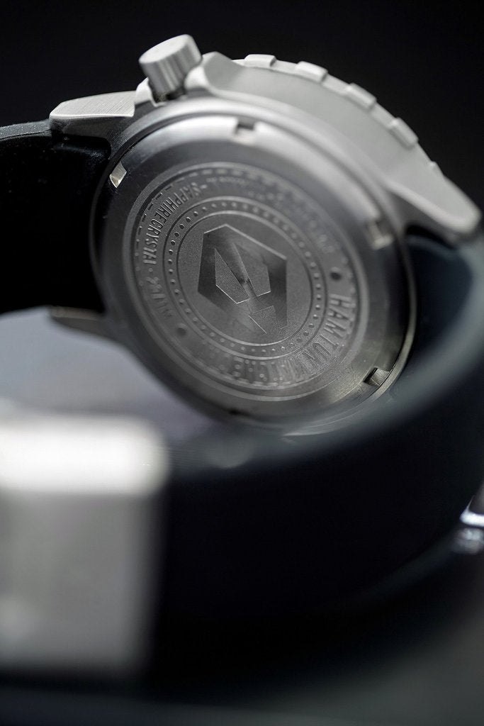 The Hamtun H1 is a high spec, affordable automatic dive watch rated to 200m. It has a titanium case, a ceramic bezel, and a Seiko NH35A movement. It comes on either our custom designed silicone or titanium straps and has drilled lugs, making swapping straps a breeze. It features a double domed sapphire crystal. Sapphire crystals are far more scratch resistant than the mineral ones you often see on affordable watches. The crown, used for winding the watch and setting the date/time, is positioned at the 4 o'clock position. This results in a more comfortable day-to-day wear as in this position it's less likely to push in to your hand. When the watch is wound and the time is set the crown screws down tightly to keep water out.